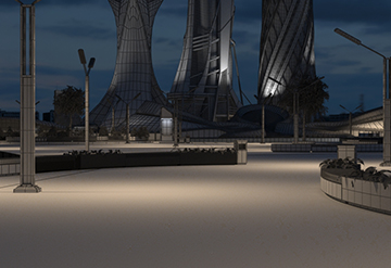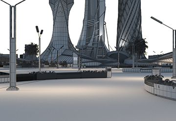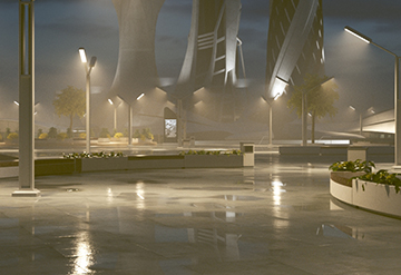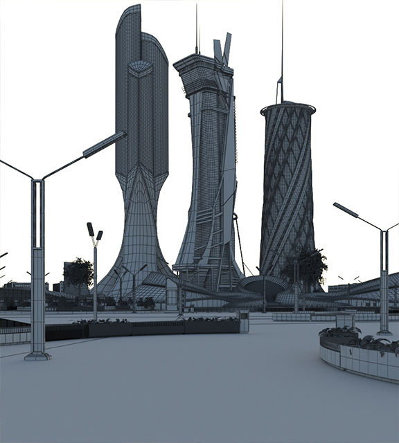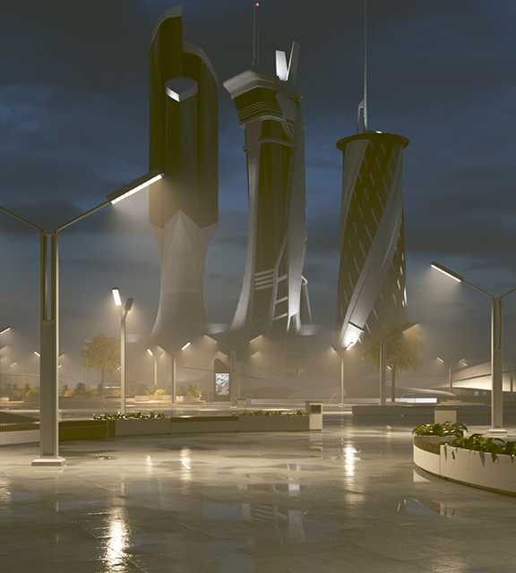 Agosto de 2019. Modelos KitBash3D. Materiais e texturização. Implantação no terreno. Lookdev final para testes de iluminação e renderização.